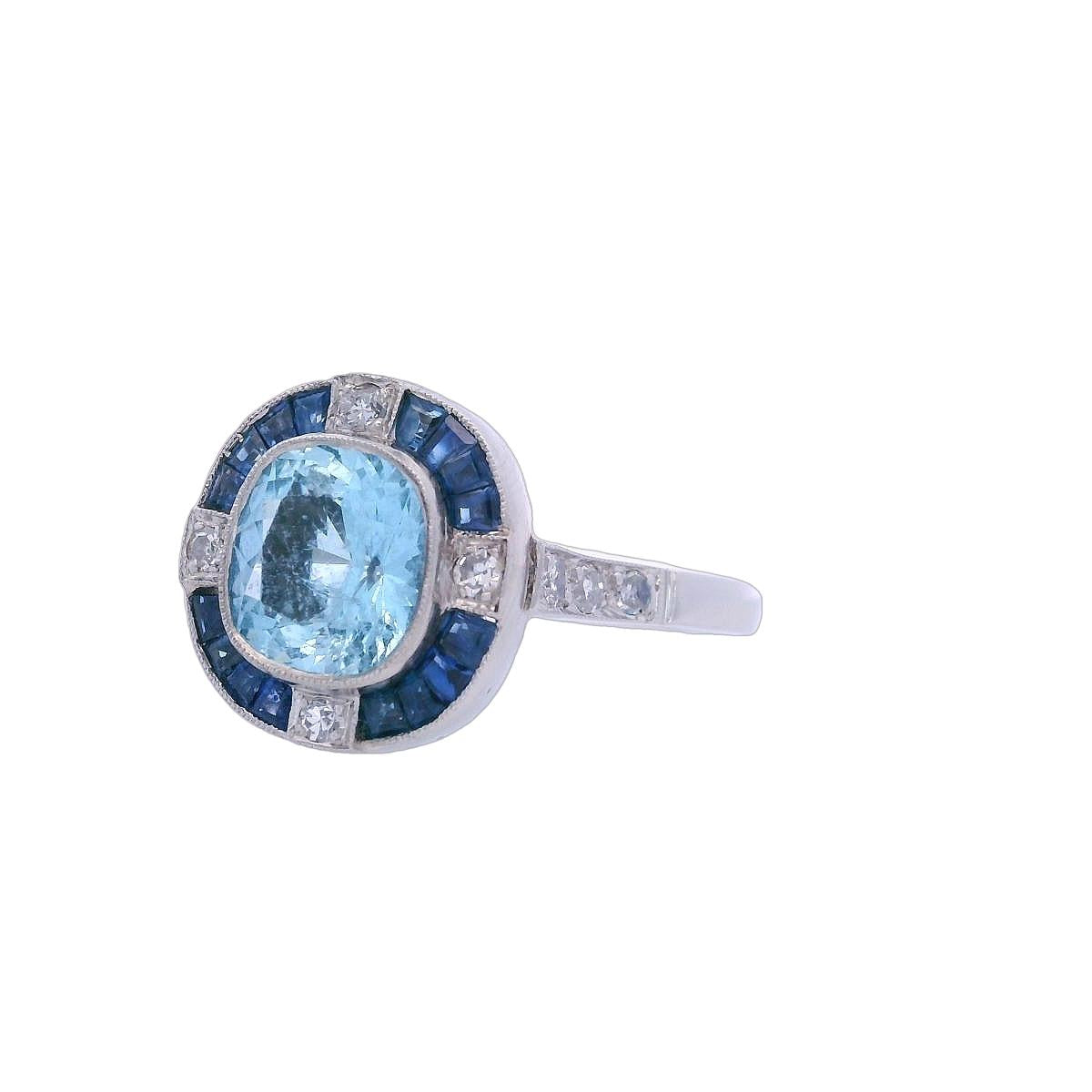 Indulge in the elegance of this exquisite Art Deco style ring expertly crafted in platinum. At its center is a stunning cushion cut aquamarine weighing approximately 2.00 carats, radiating a serene blue hue that captures the essence of oceanic beauty.