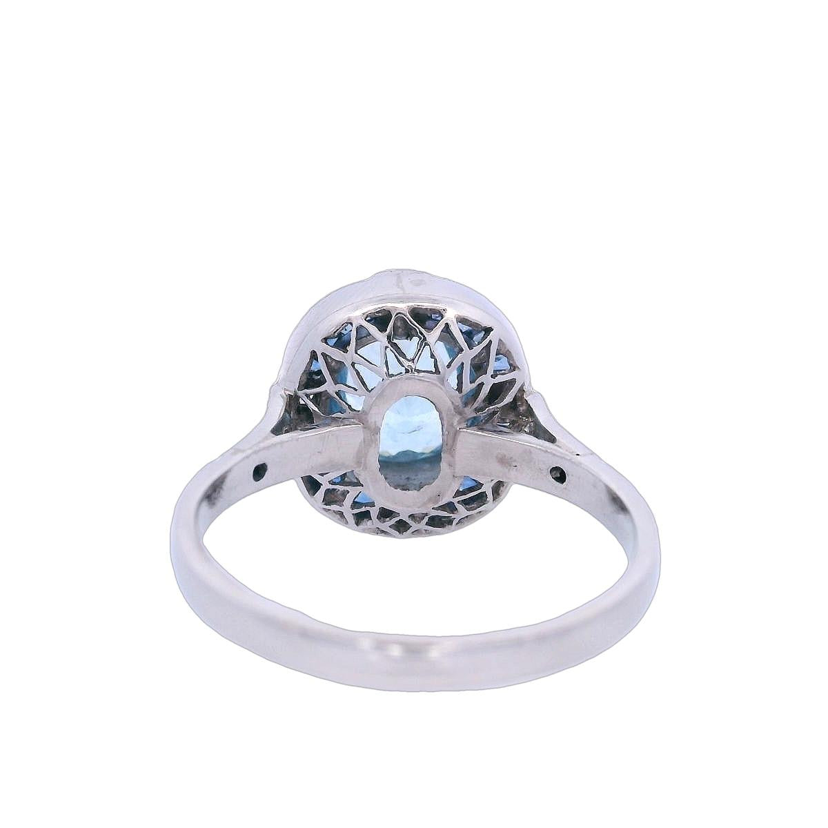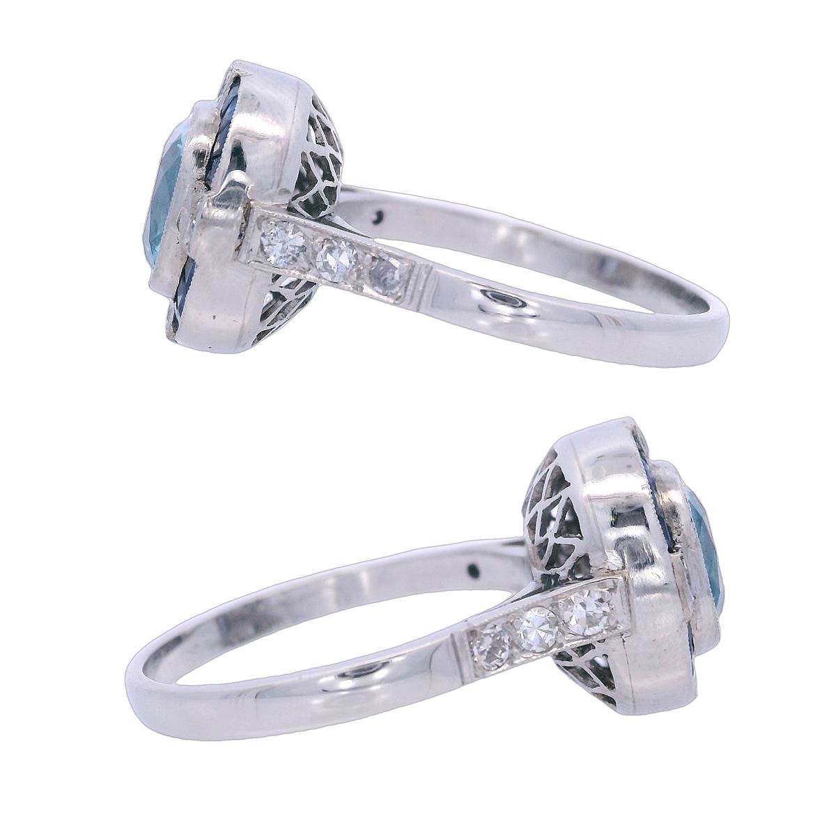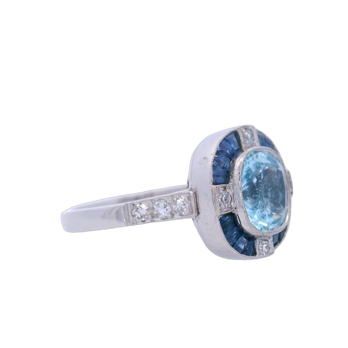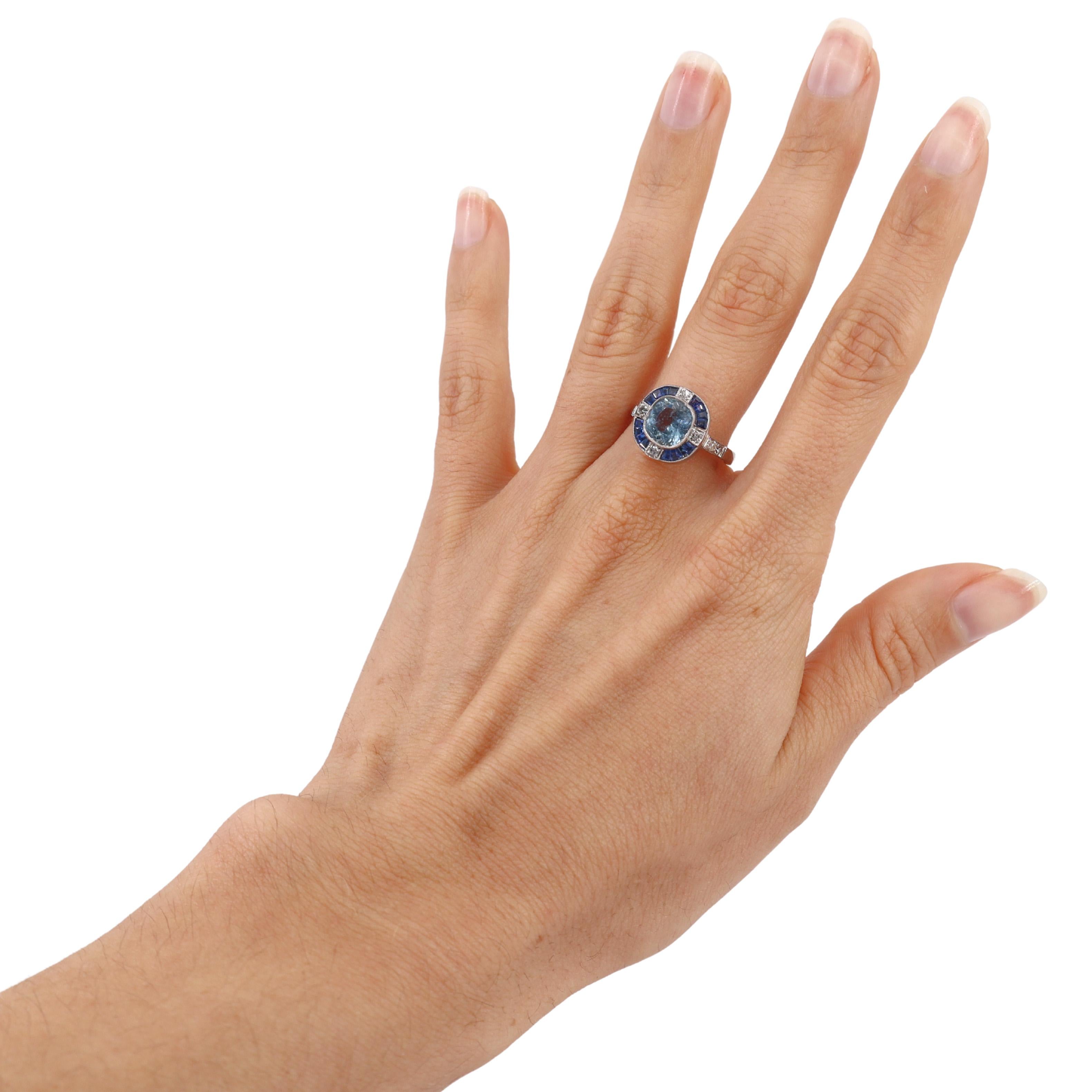 Surrounding the aquamarine are 16 square cut blue sapphires, collectively weighing about 0.50 carats, creating a striking contrast that enhances the center stone's allure. Additionally, the ring features 10 round cut diamonds with a total weight of approximately 0.25 carats, all graded as colorless for exceptional brilliance.