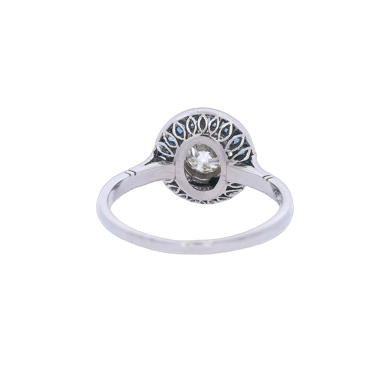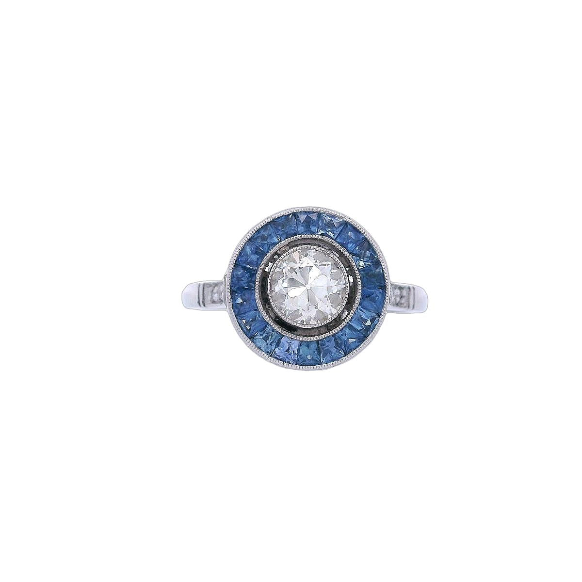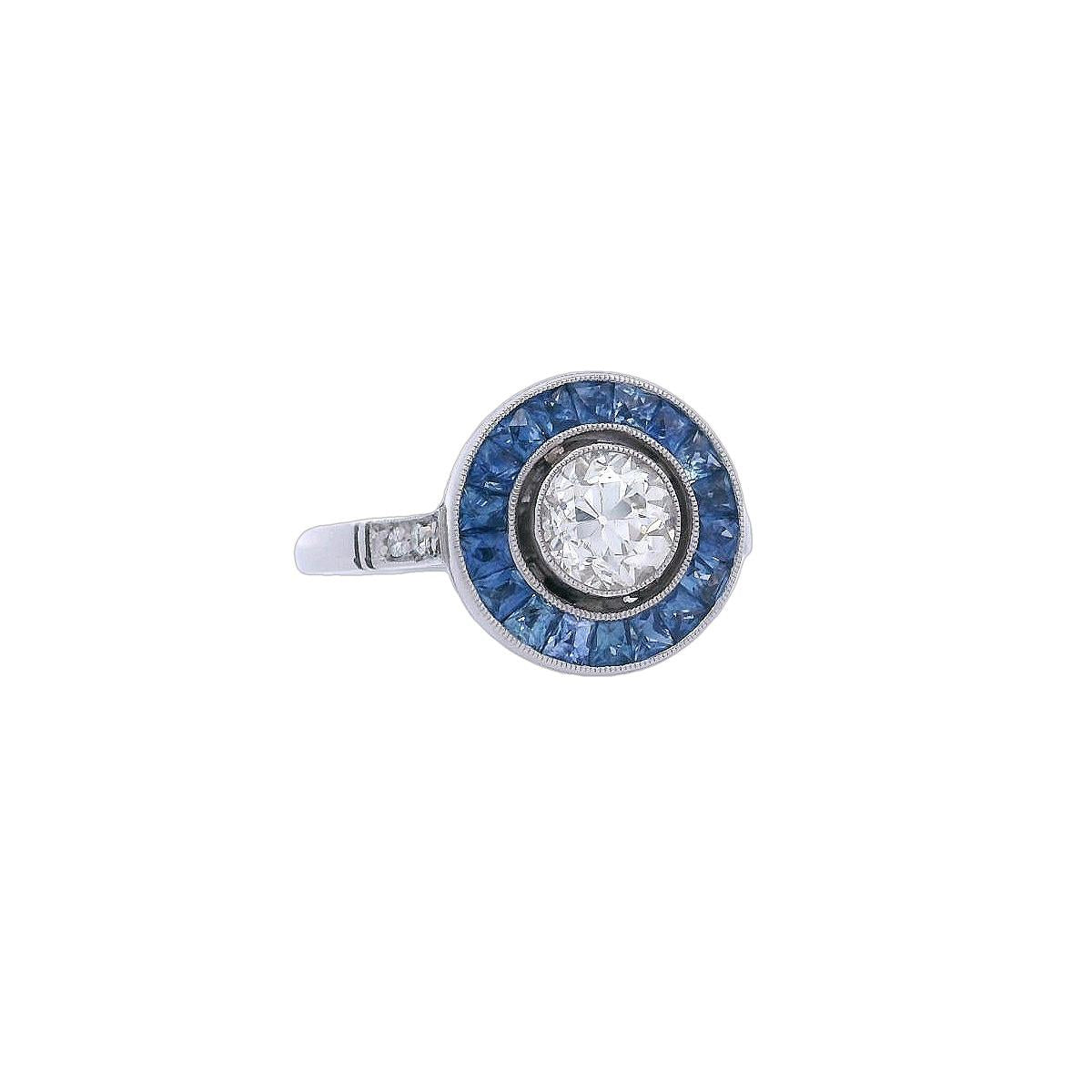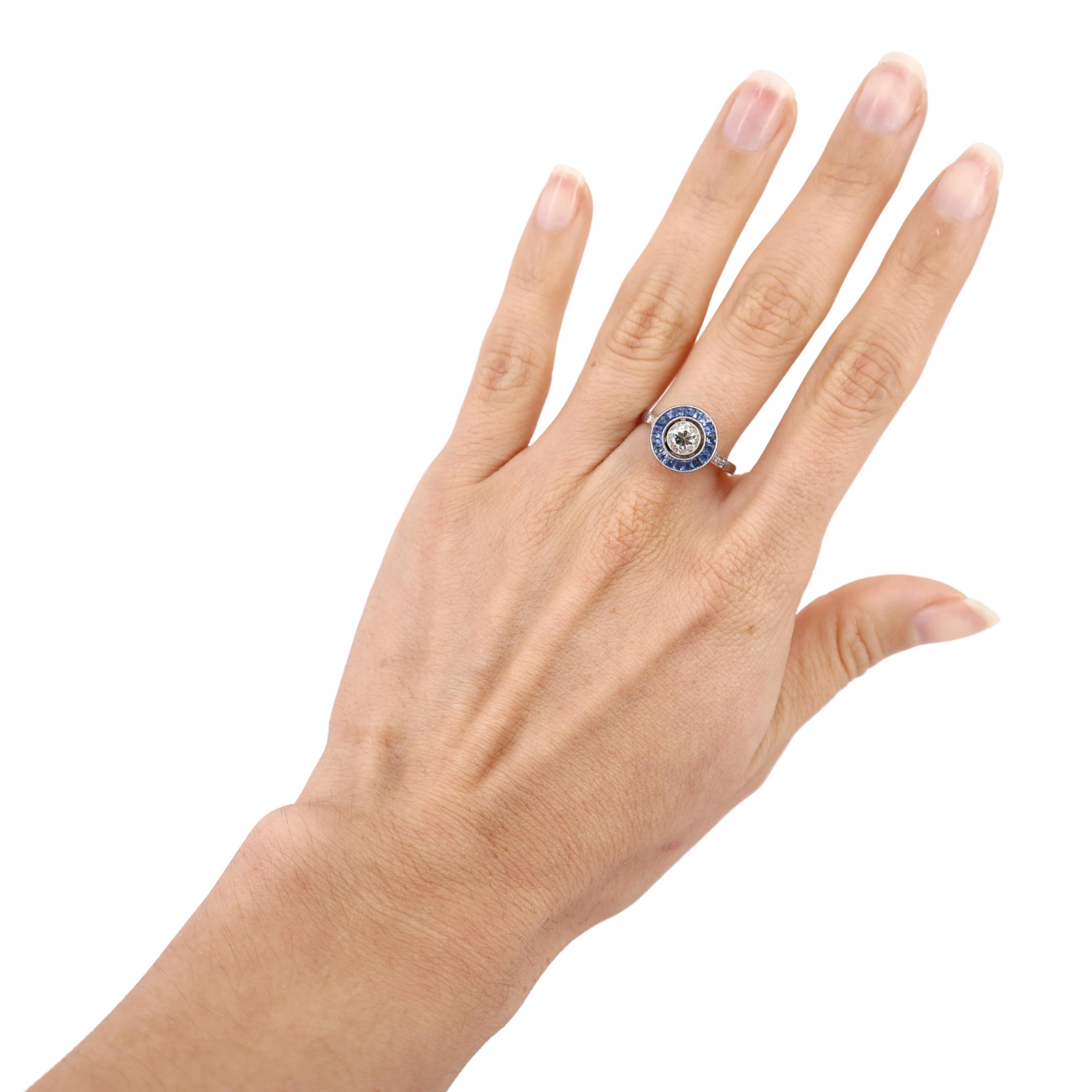 Encircling the center diamond are 18 French Cut Blue Sapphires, collectively weighing approximately 0.55 carats, adding a vibrant contrast and elegance to the design. The ring is further embellished with six additional diamonds on the shoulders, totaling approximately 0.10 carats, enhancing its overall brilliance.