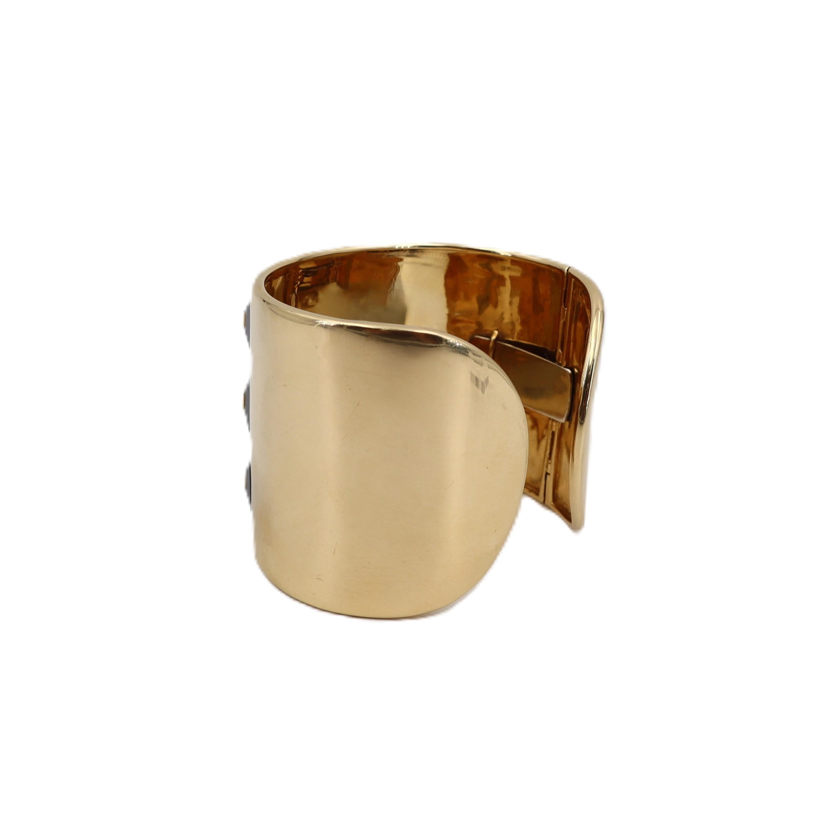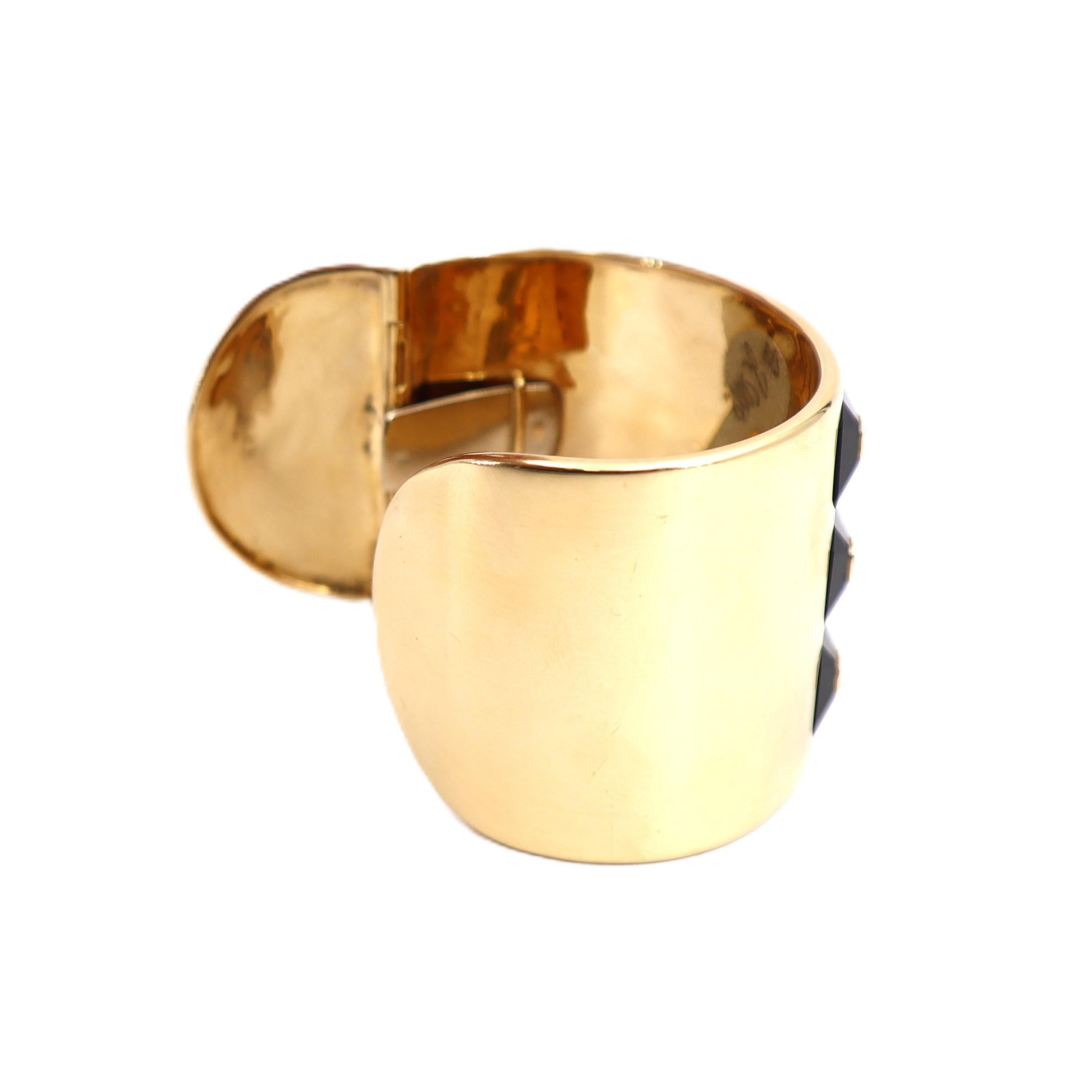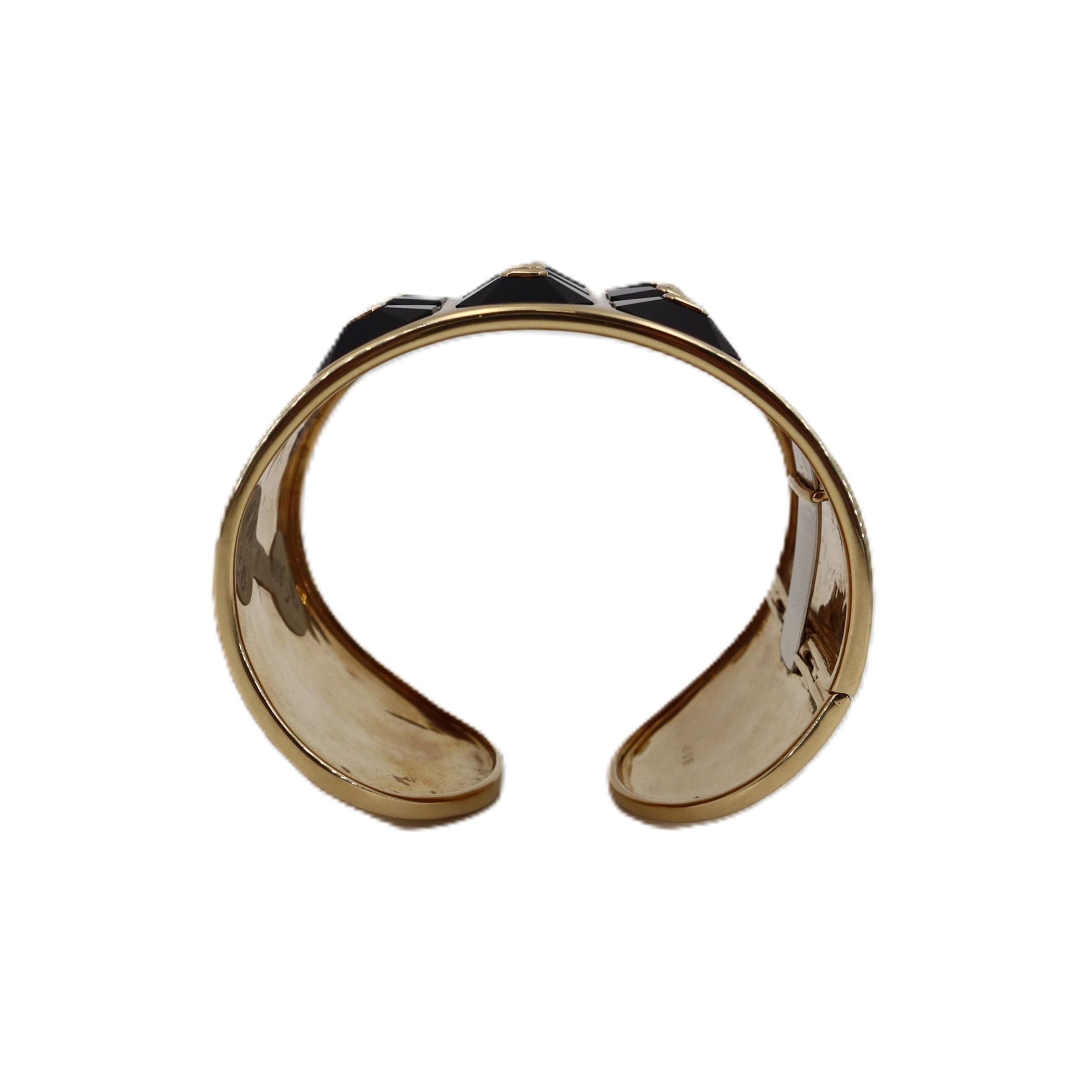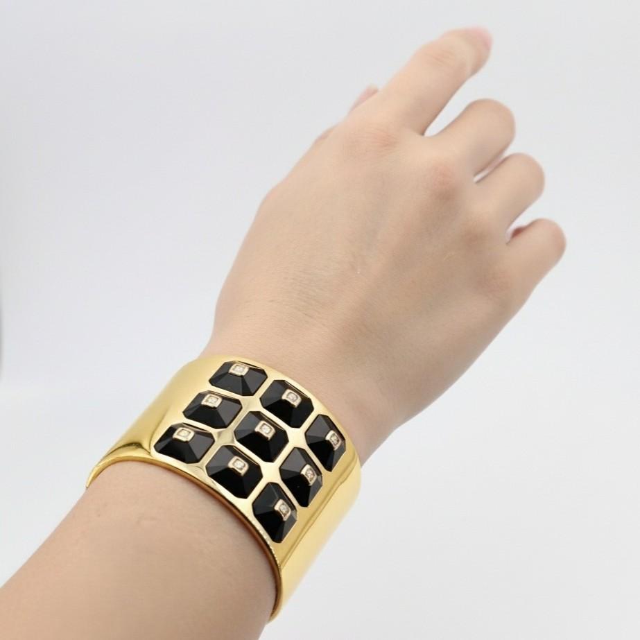 CONDITION & AUTHENTICITY: The overall condition of this piece is excellent. There is no damage to the gold settings. All octagonal onyx stations and centered diamonds are securely set in their mountings, and the hinged closure functions perfectly, displaying exceptional designer craftsmanship.
