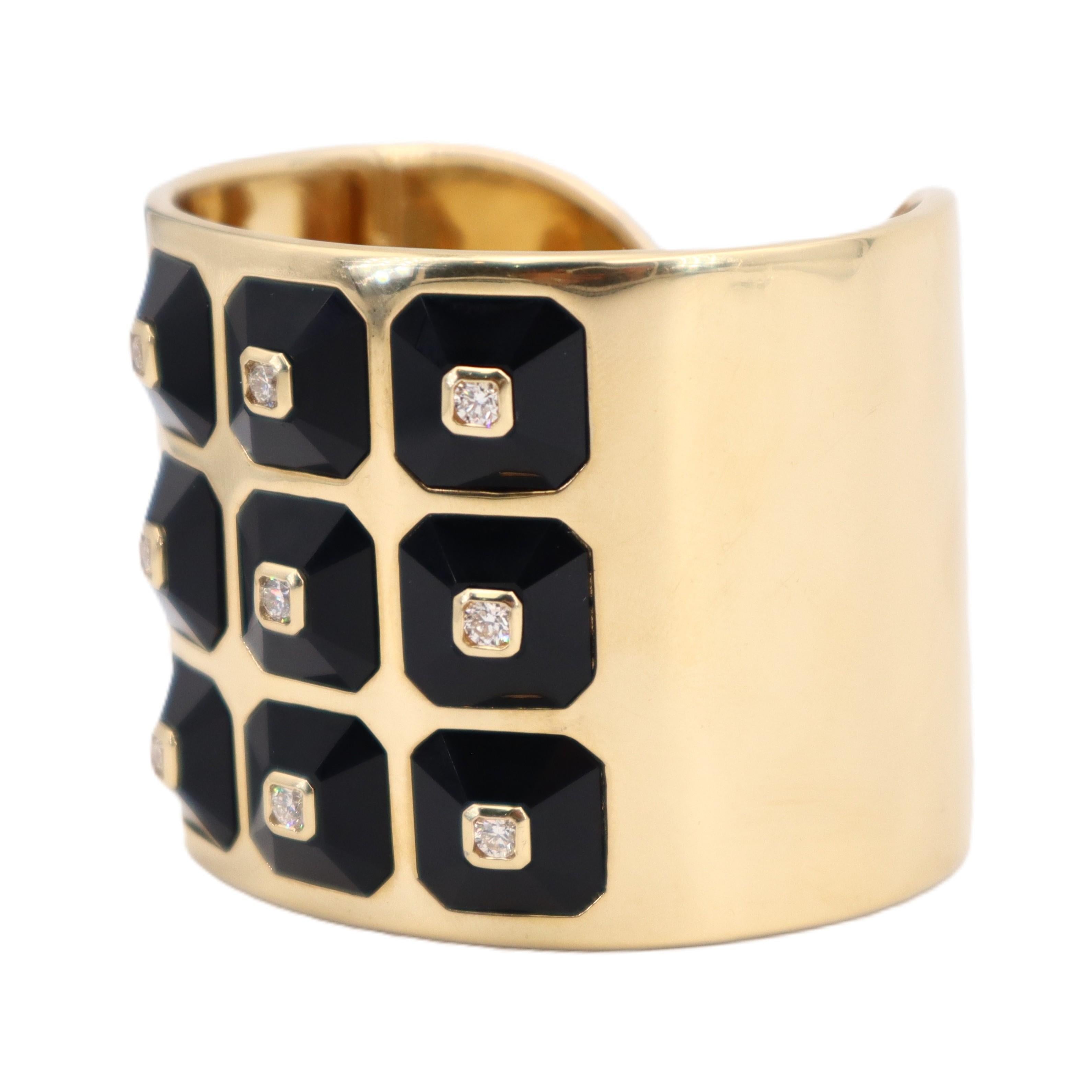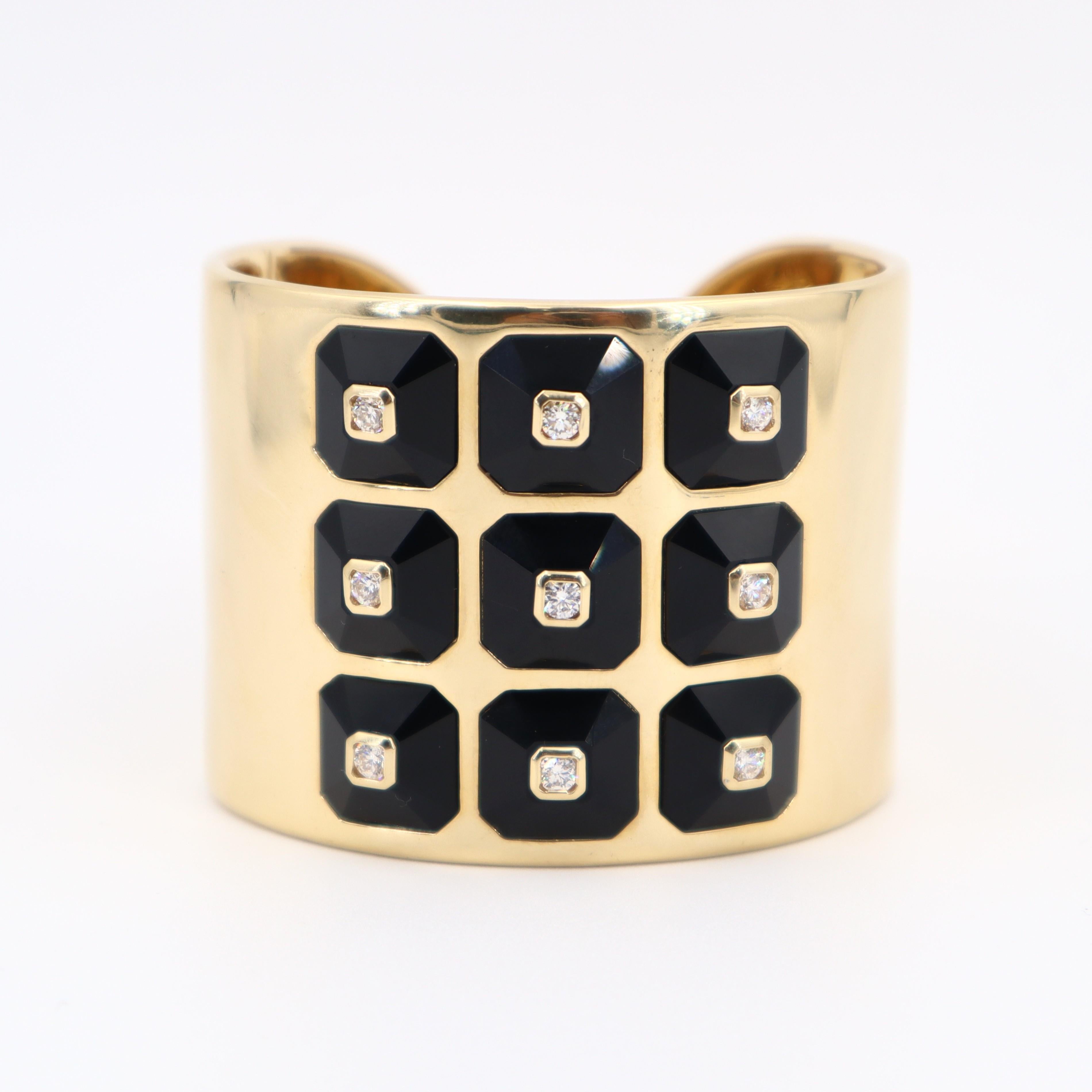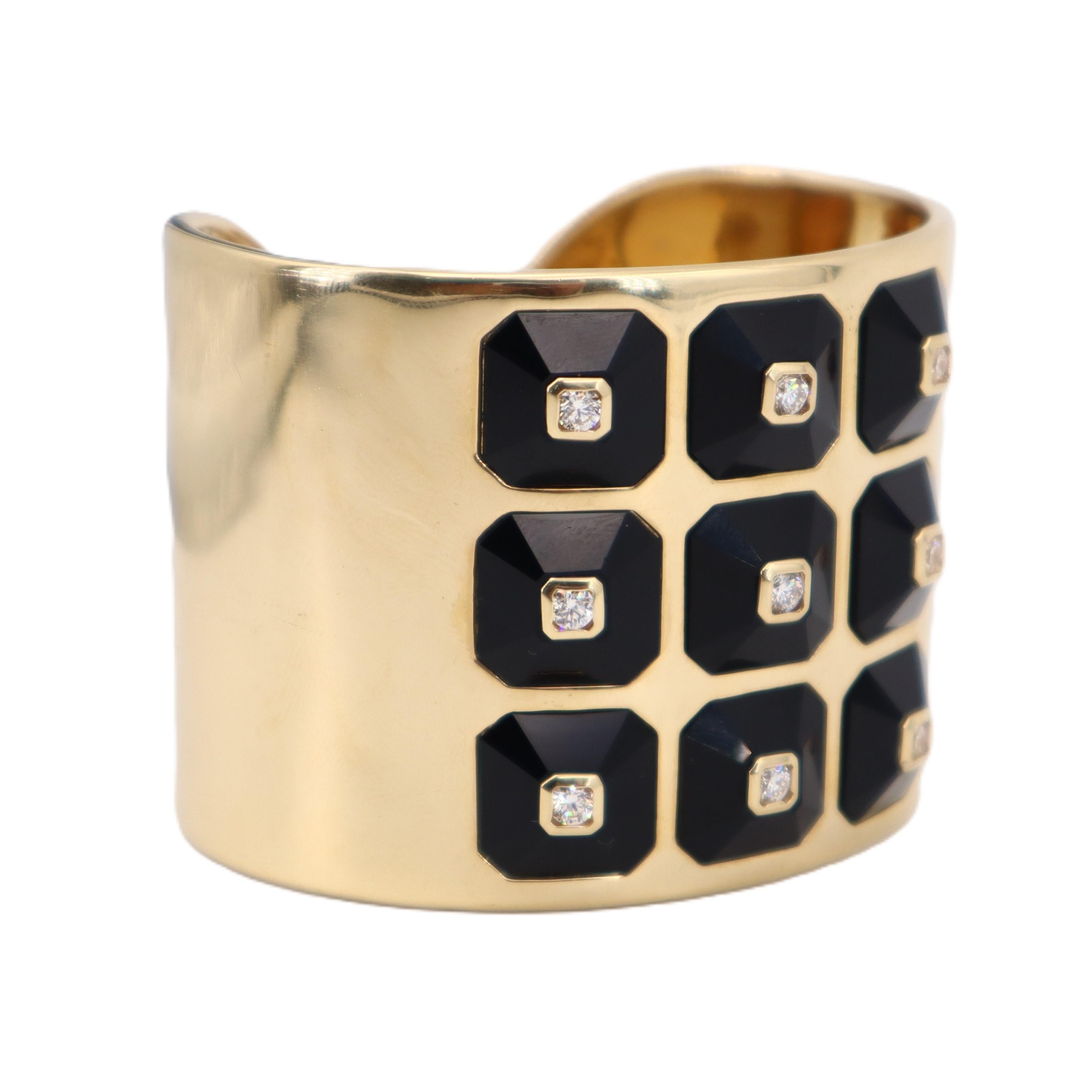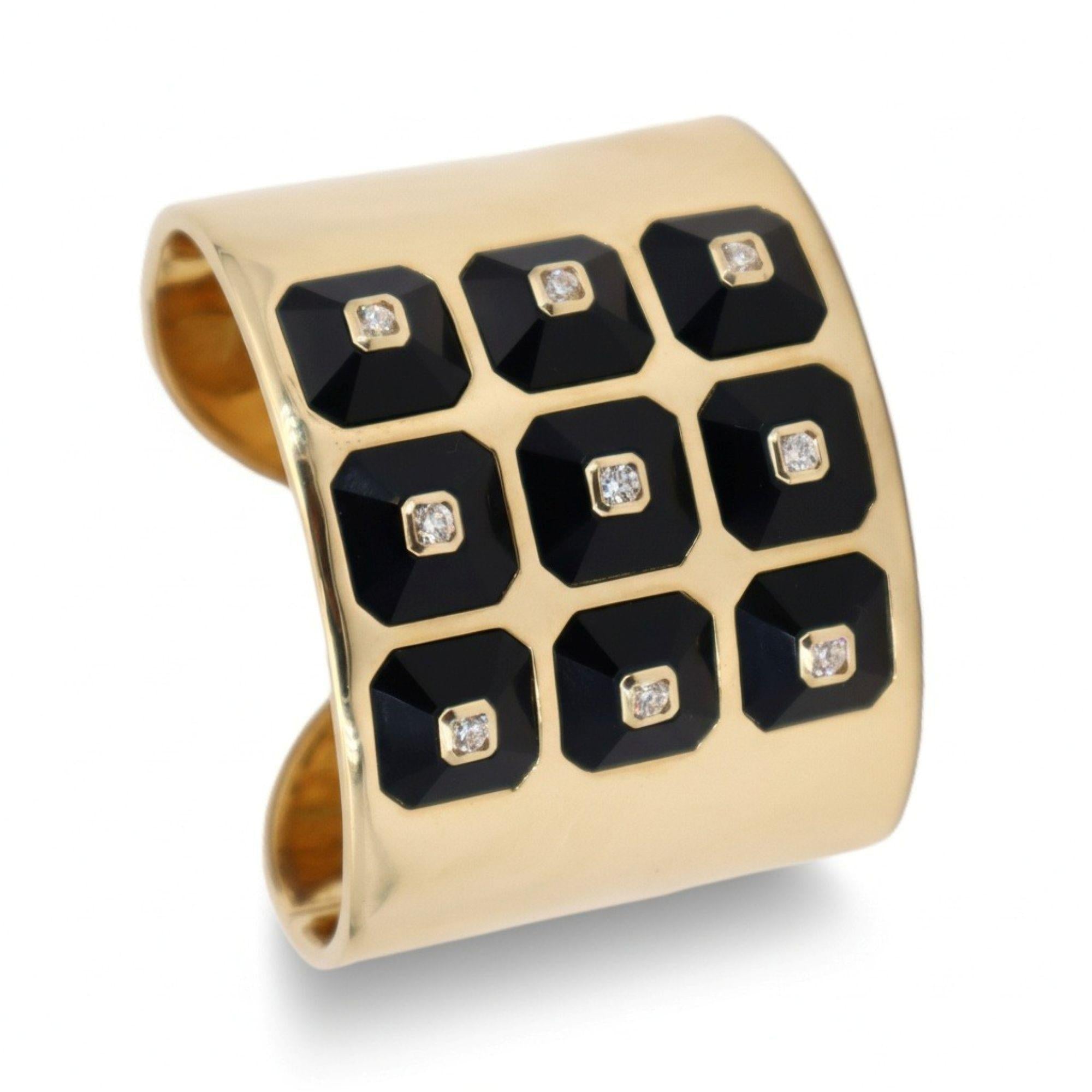 This exceptional cuff bracelet from designer Maria Canale represents the pinnacle of contemporary luxury design, expertly crafted in lustrous 18kt yellow gold and featuring 9 octagonal-shaped onyx stations totaling 78.57 carats that create bold graphic impact. Each onyx station is elegantly centered with a round brilliant-cut diamond, with 9 diamonds totaling 1.22 carats in exceptional F-G color and VVS1 clarity that add brilliant sparkle against the dramatic black onyx.