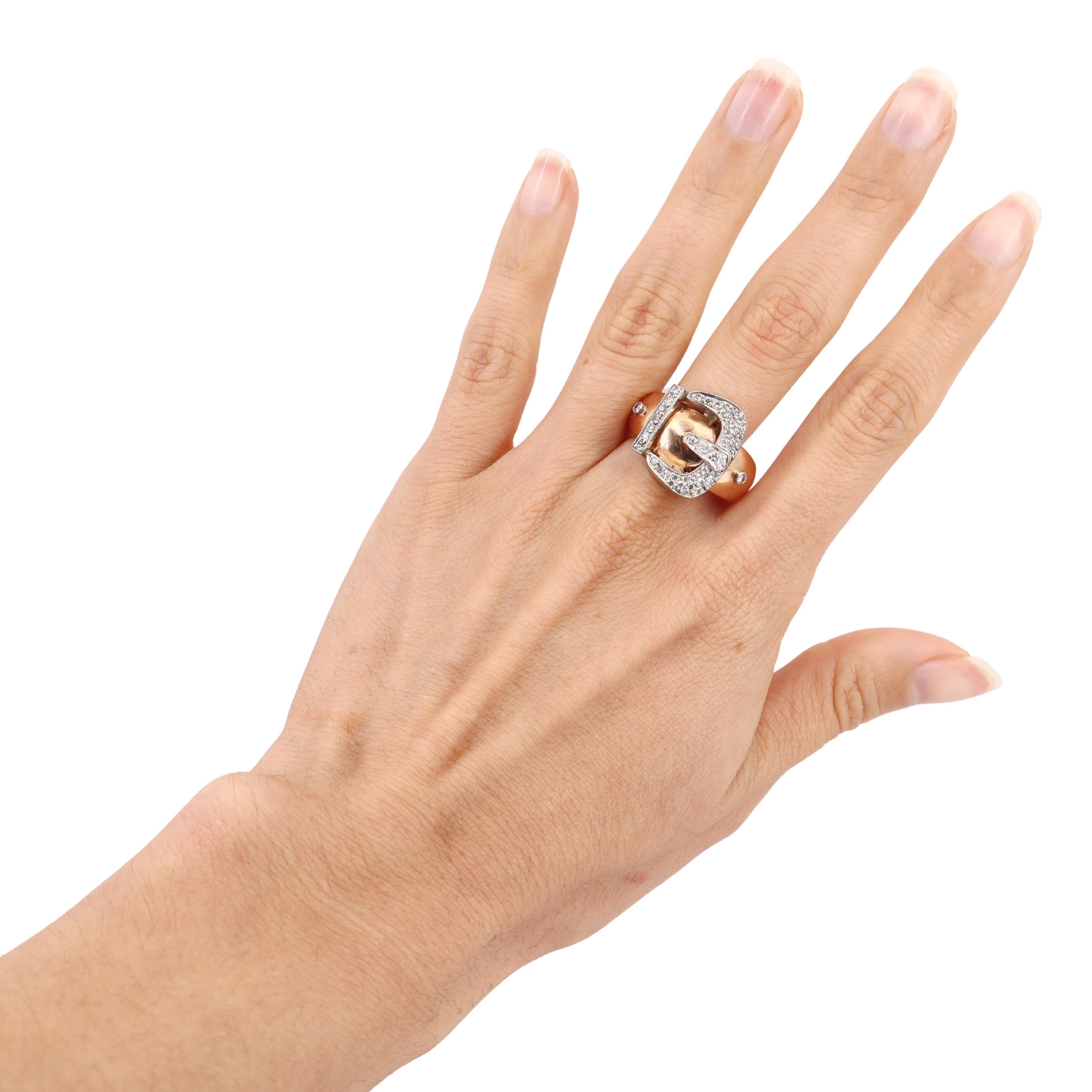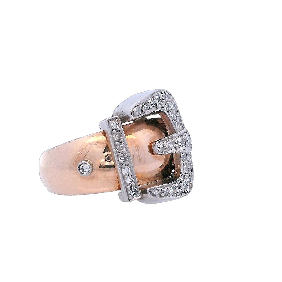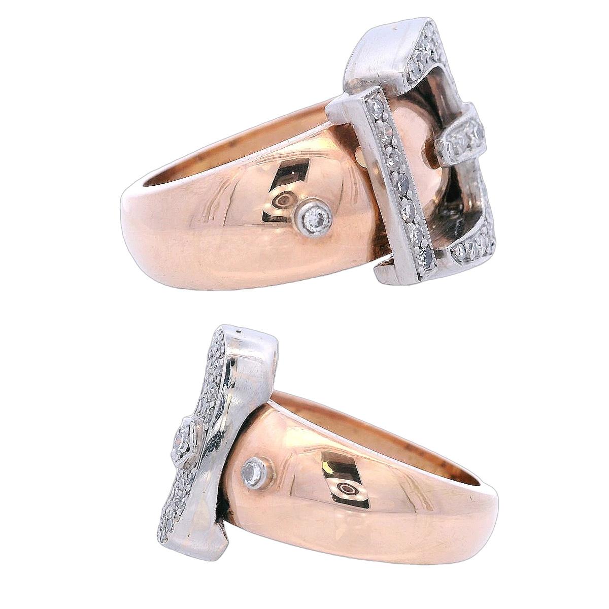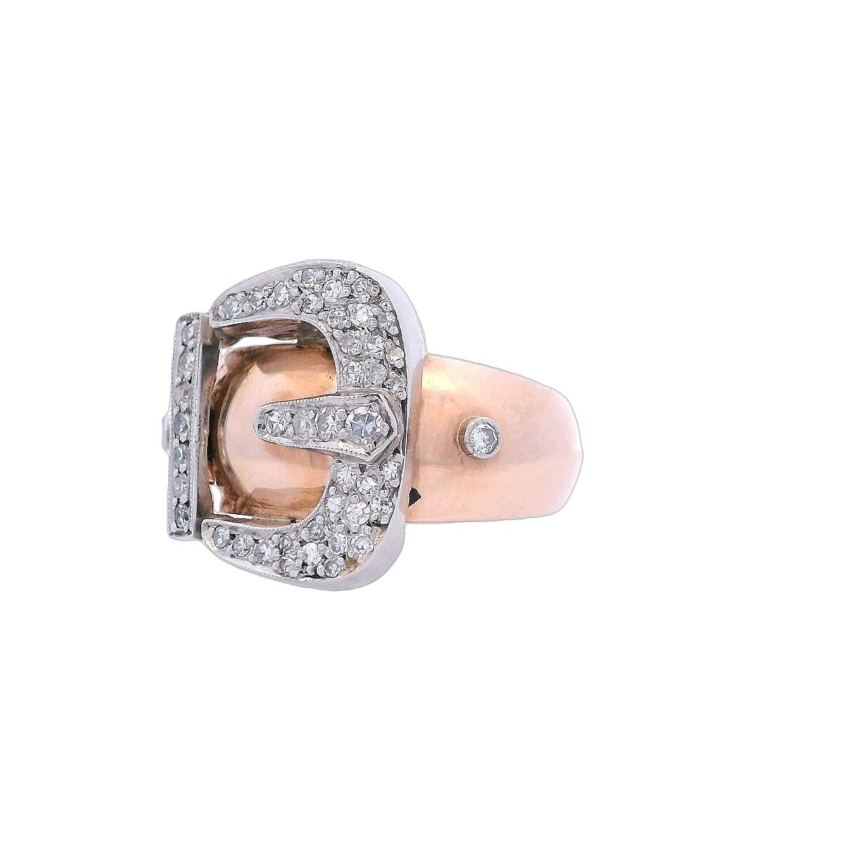 Step back in time with this exquisite Circa 1940s Retro Belt Ring, meticulously crafted in 18kt yellow gold and platinum. This unique piece showcases a design that embodies the bold and stylish spirit of the retro era.