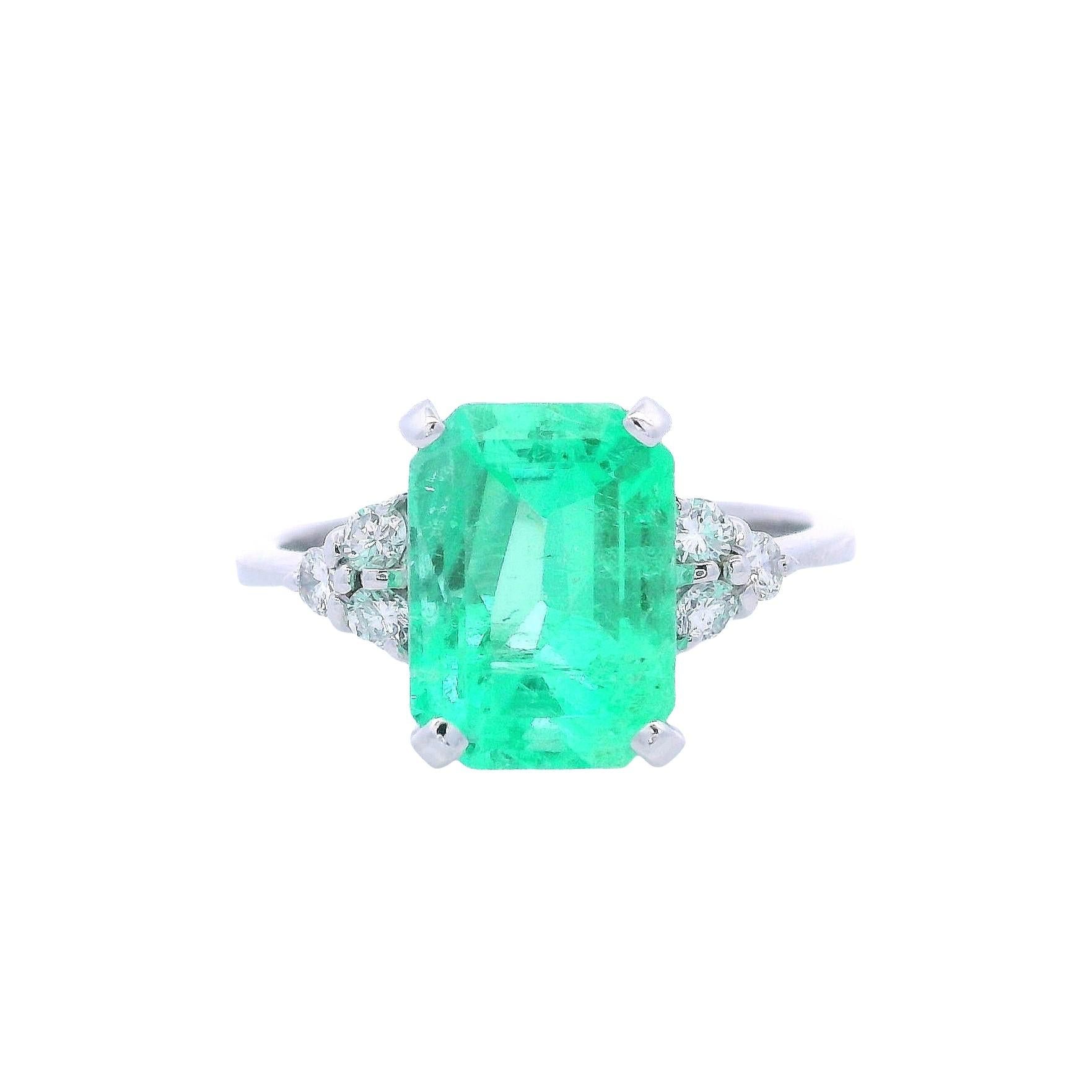 This stunning engagement ring showcases the captivating beauty of natural emerald, expertly crafted in lustrous 14kt white gold and set in the center with a magnificent emerald-cut emerald weighing approximately 4.15 carats that displays the coveted rich green color prized by collectors worldwide. The sophisticated emerald-cut faceting creates elegant linear sparkle and showcases the gemstone's natural beauty, while six round-cut diamonds on the sides totaling 0.30 carats in G-H color and VS1 clarity add brilliant accents that enhance the emerald's vibrant presence.