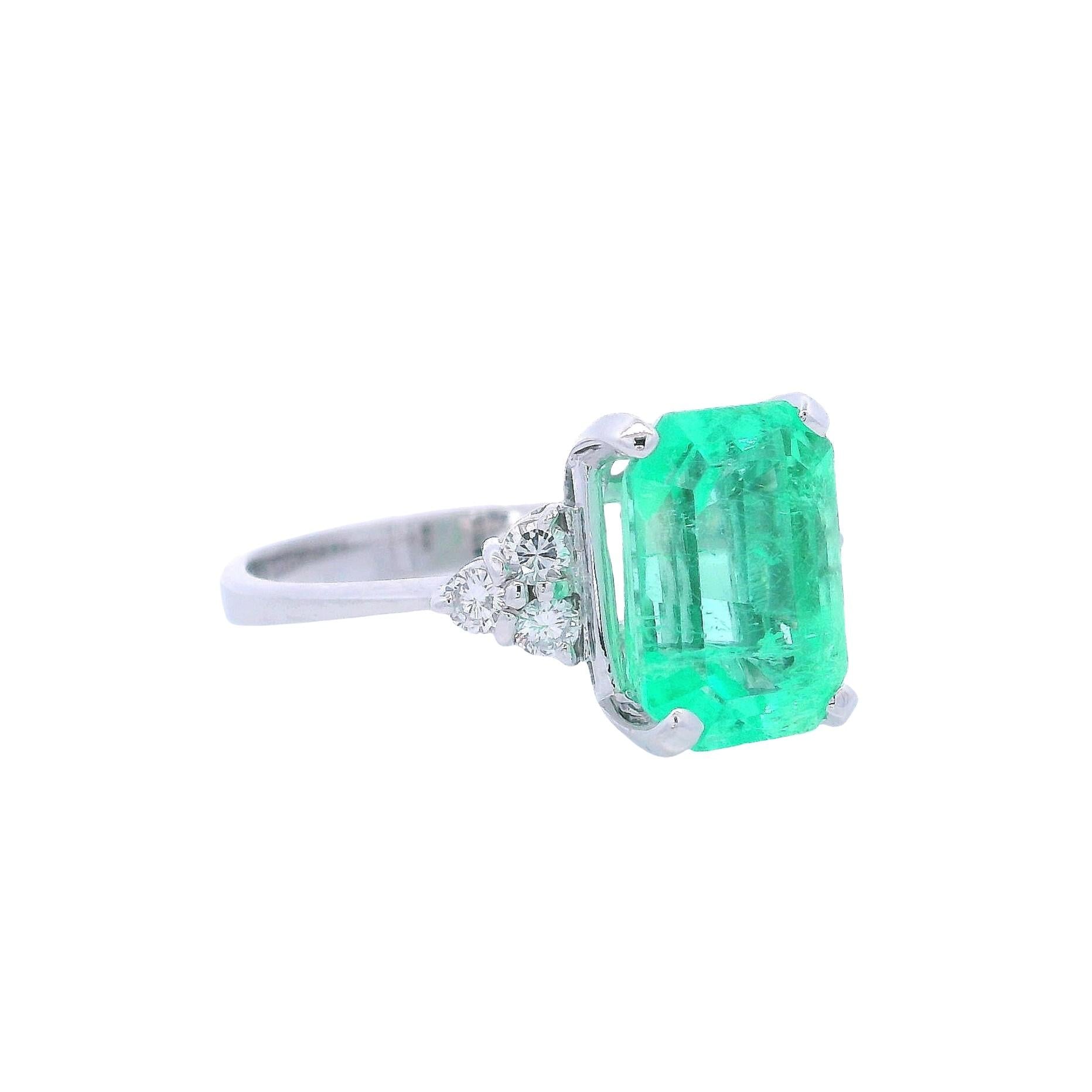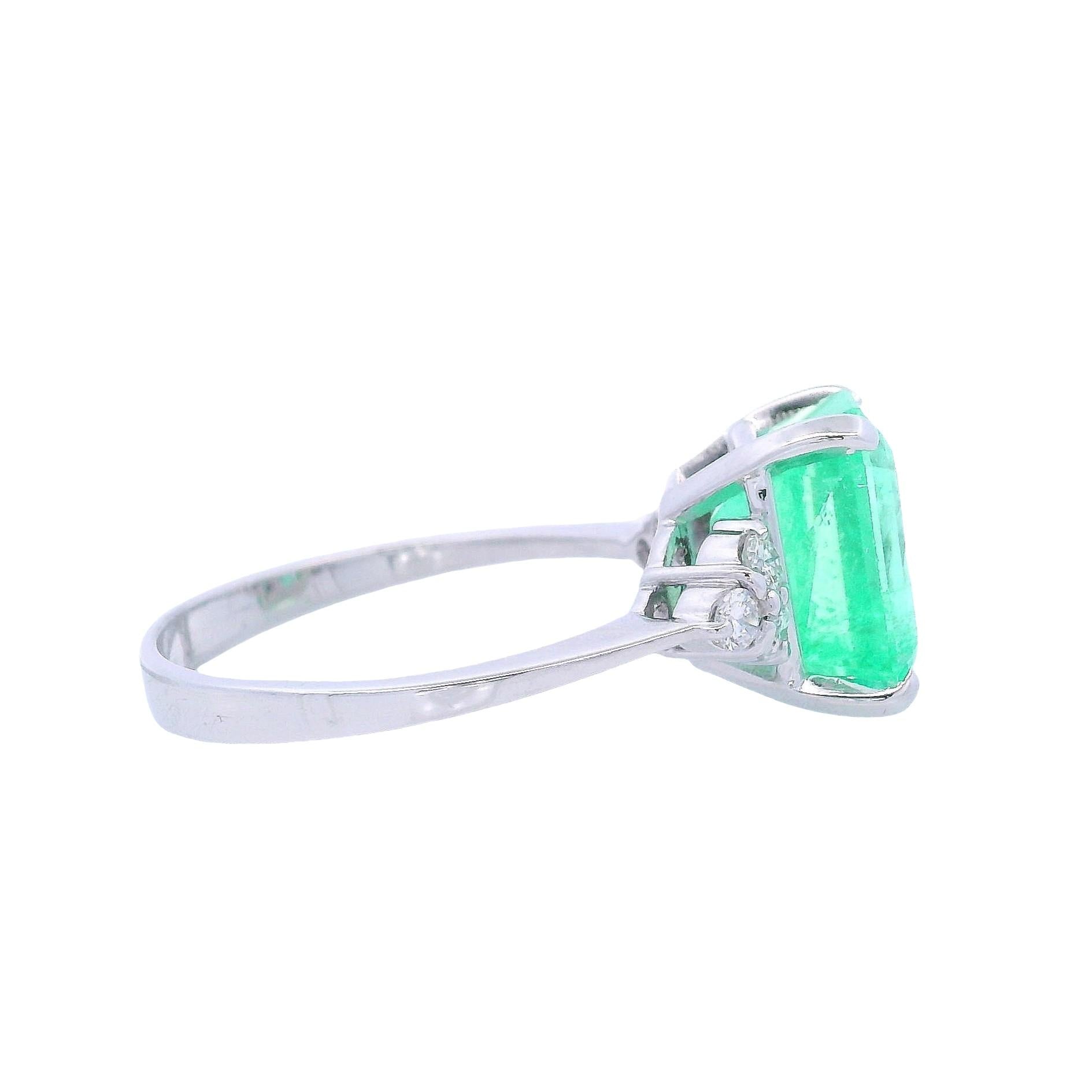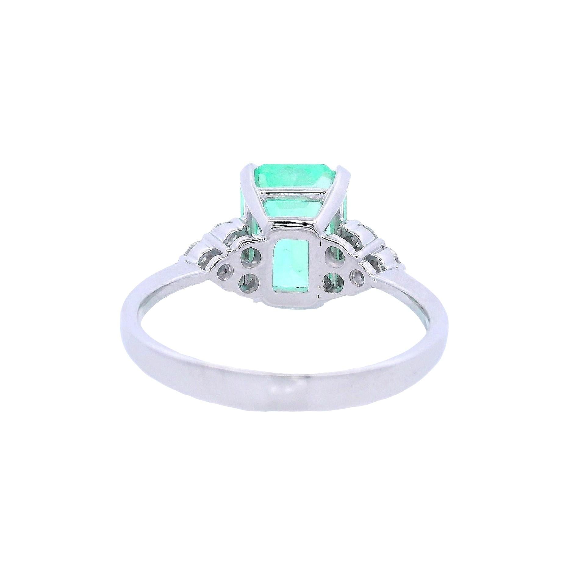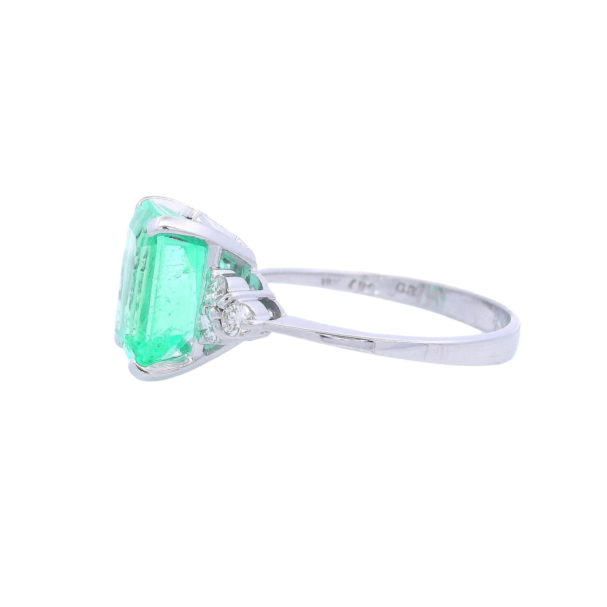 CONDITION & AUTHENTICITY: The overall condition of this piece is excellent. There is no damage to the white gold settings. The emerald-cut emerald displays beautiful color and clarity, and all six diamonds are securely set in their mountings, showcasing quality craftsmanship.