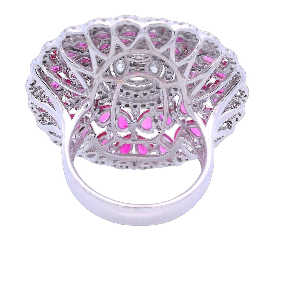 The pièce de résistance of this magnificent ring is the 40 pear-shaped pink sapphires that weigh together approximately 14.0 carats, providing a vibrant pop of color that beautifully contrasts with the diamonds.