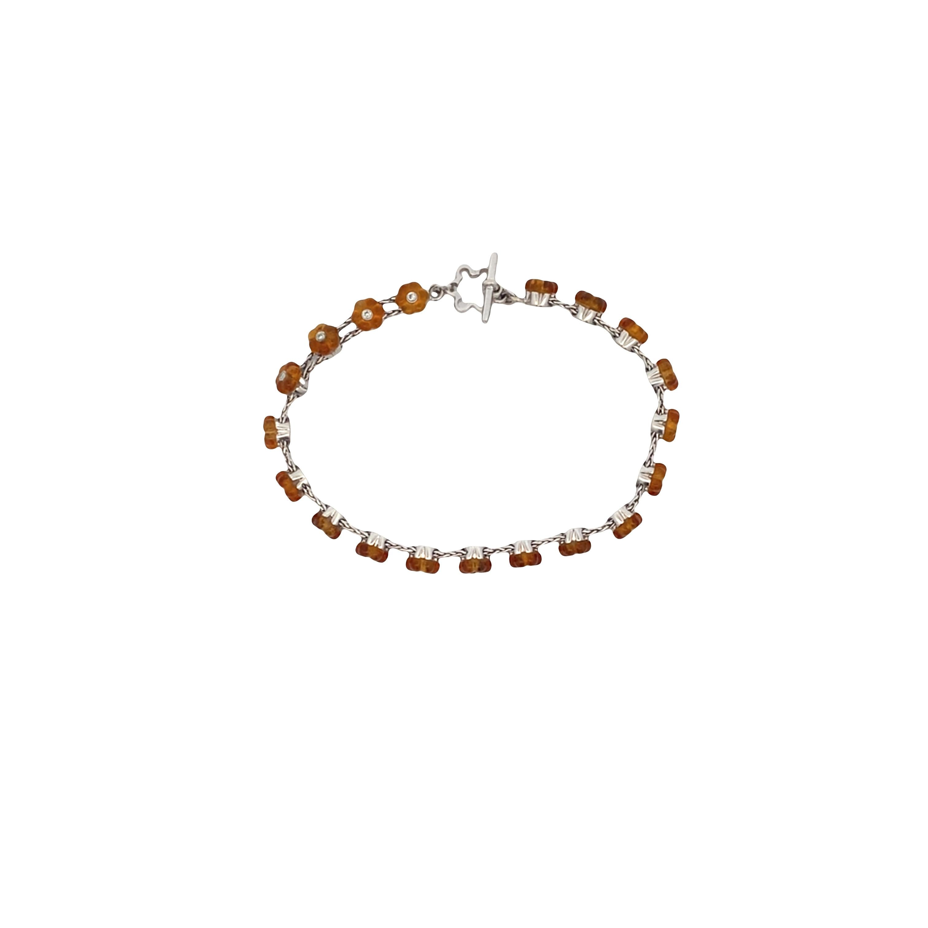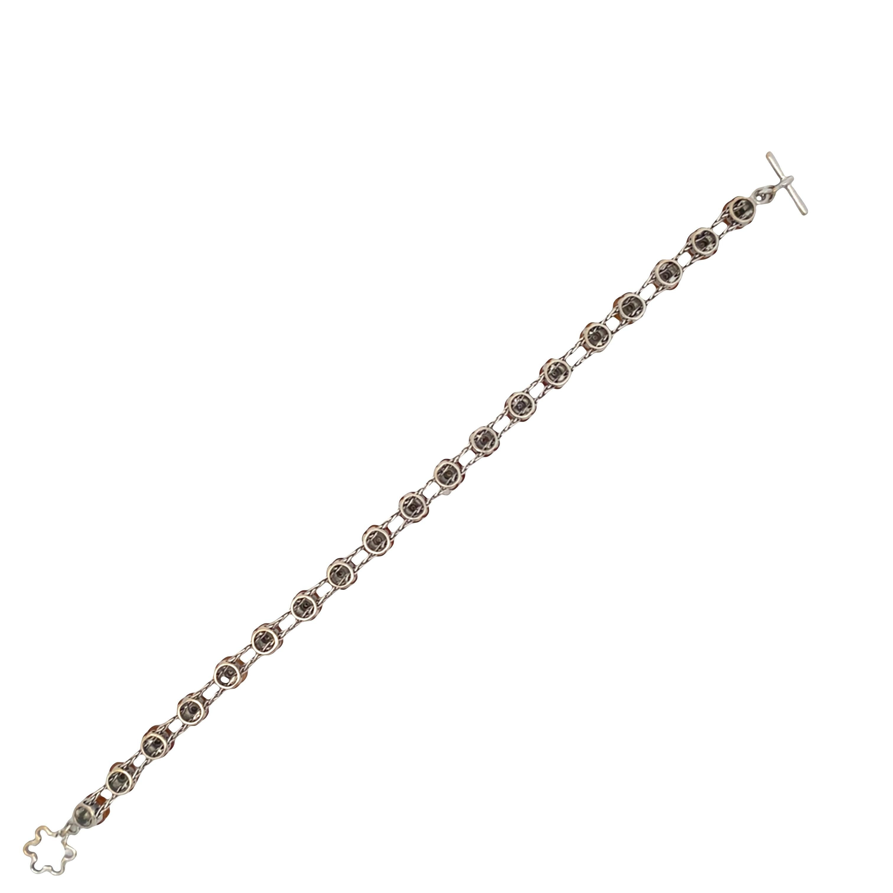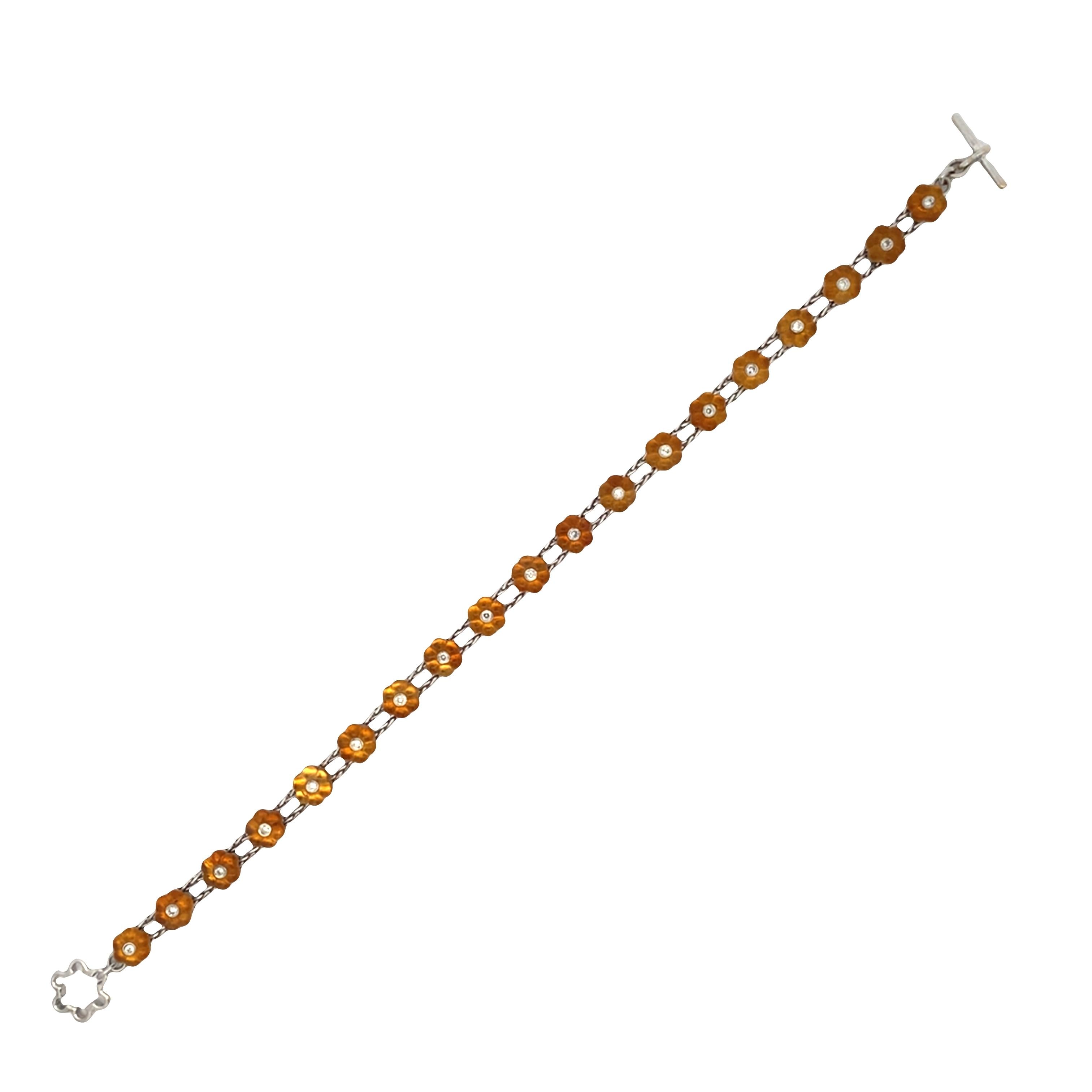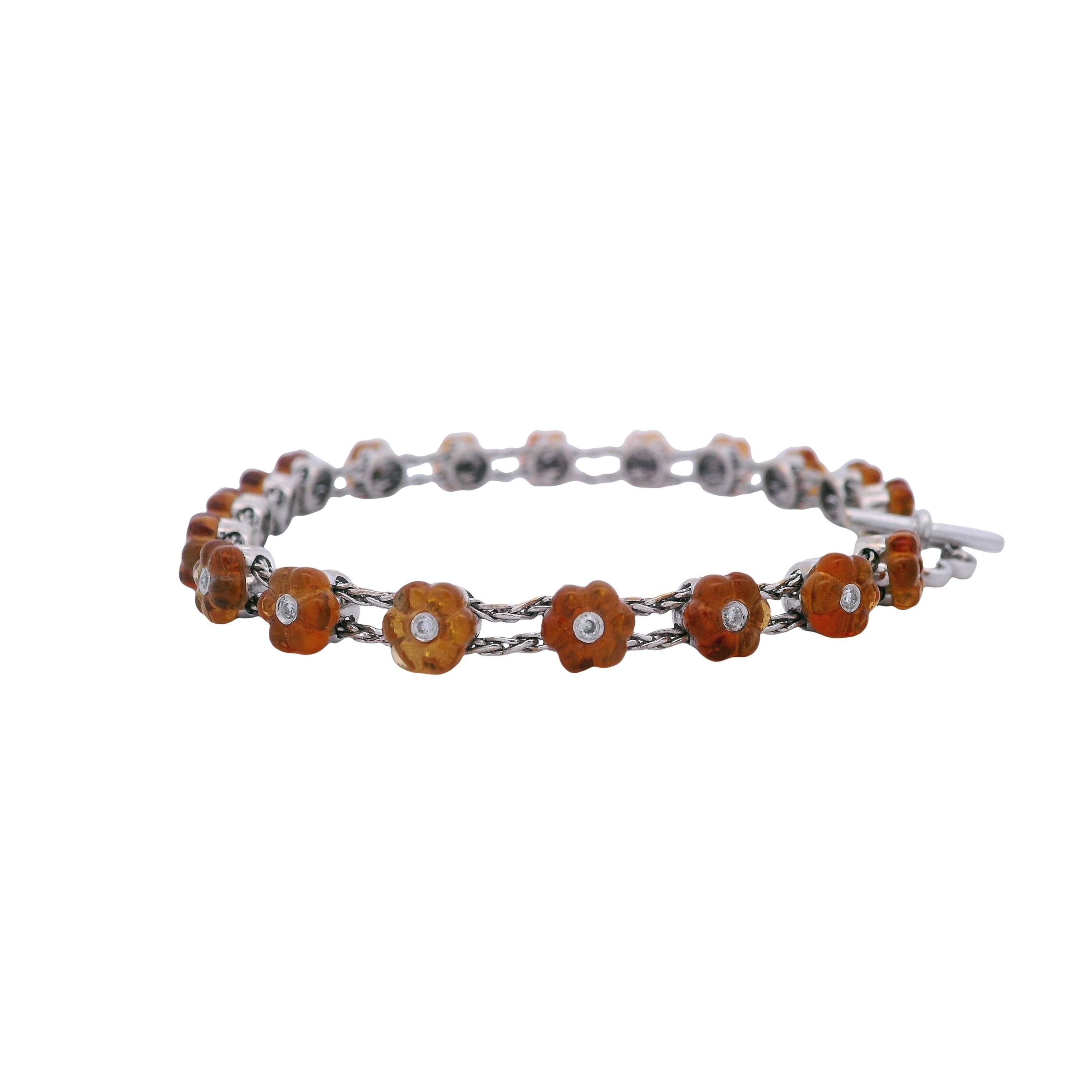 This elegant flower toggle bracelet is expertly crafted in 18kt white gold, featuring 19 intricately carved citrines, each sculpted into a delicate flower motif. Every citrine blossom is embellished with a round-cut diamond, for a total diamond weight of approximately 0.20 carats in H color, adding a subtle sparkle to the refined design.