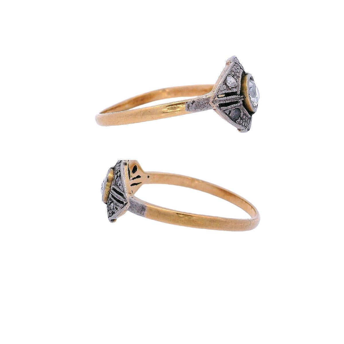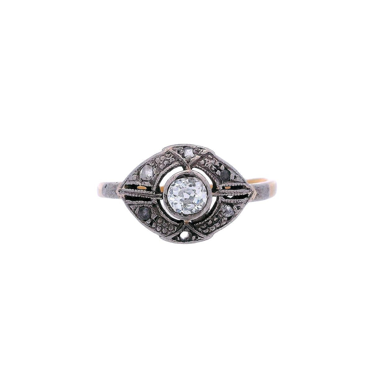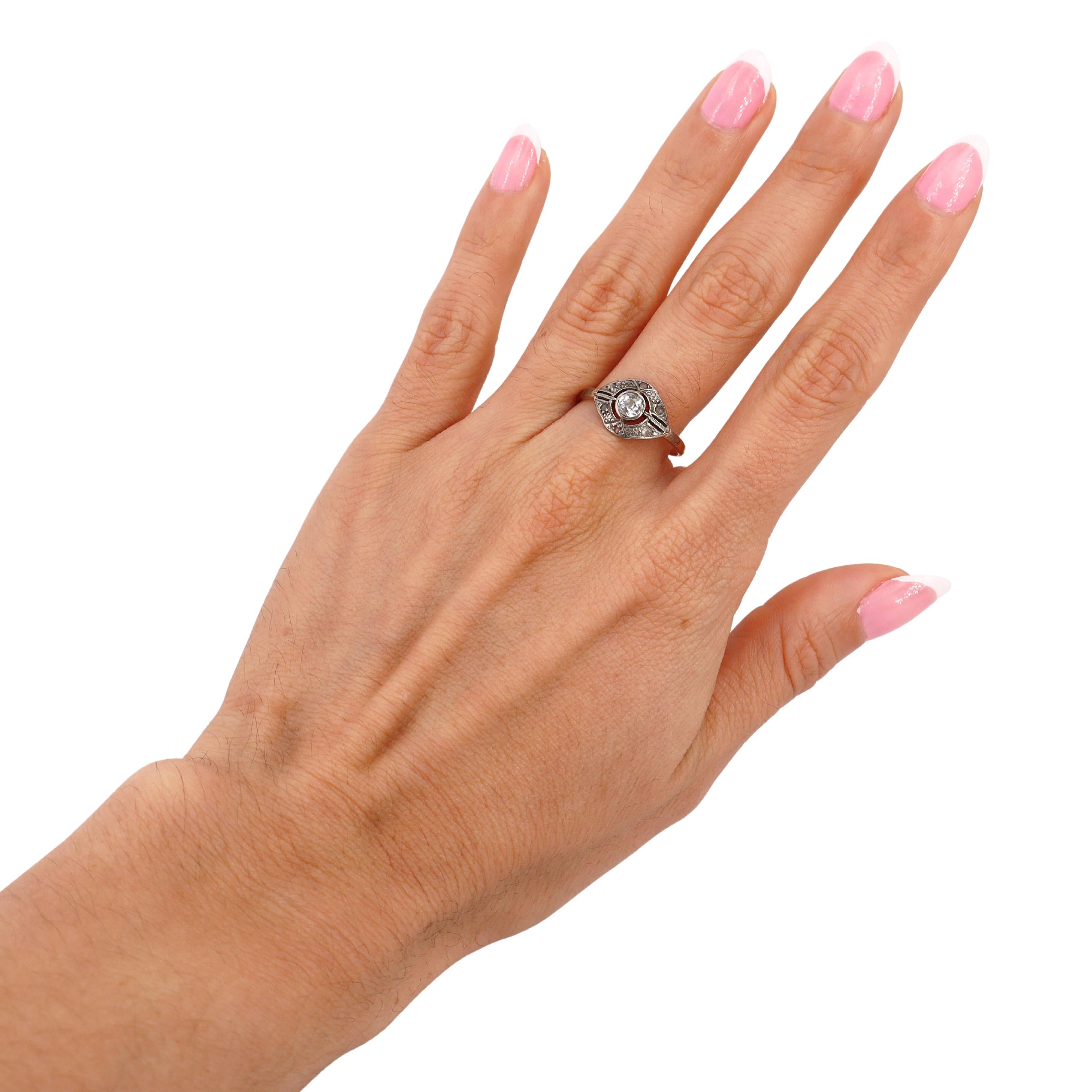 At its center is an old mine-cut diamond, weighing approximately 0.30 carats, graded H-J color and VS2 clarity, radiating a beautiful vintage brilliance. Surrounding the centerpiece are six rose-cut diamonds, with a combined weight of approximately 0.03 carats, adding a delicate sparkle to the design. This ring is a stunning symbol of Edwardian artistry, perfect for those who treasure antique jewelry with enduring charm.