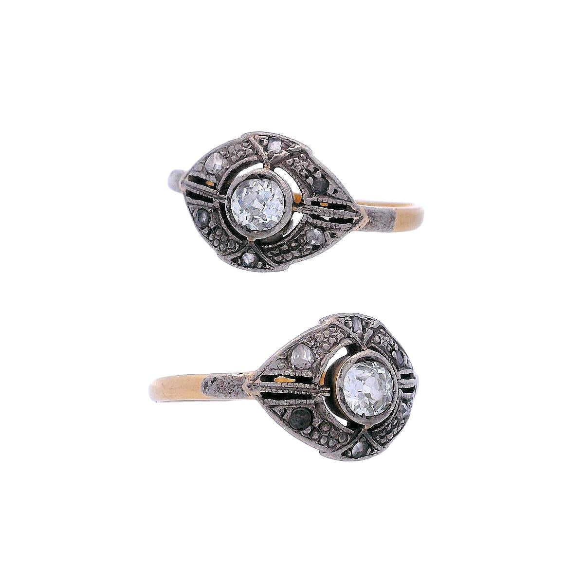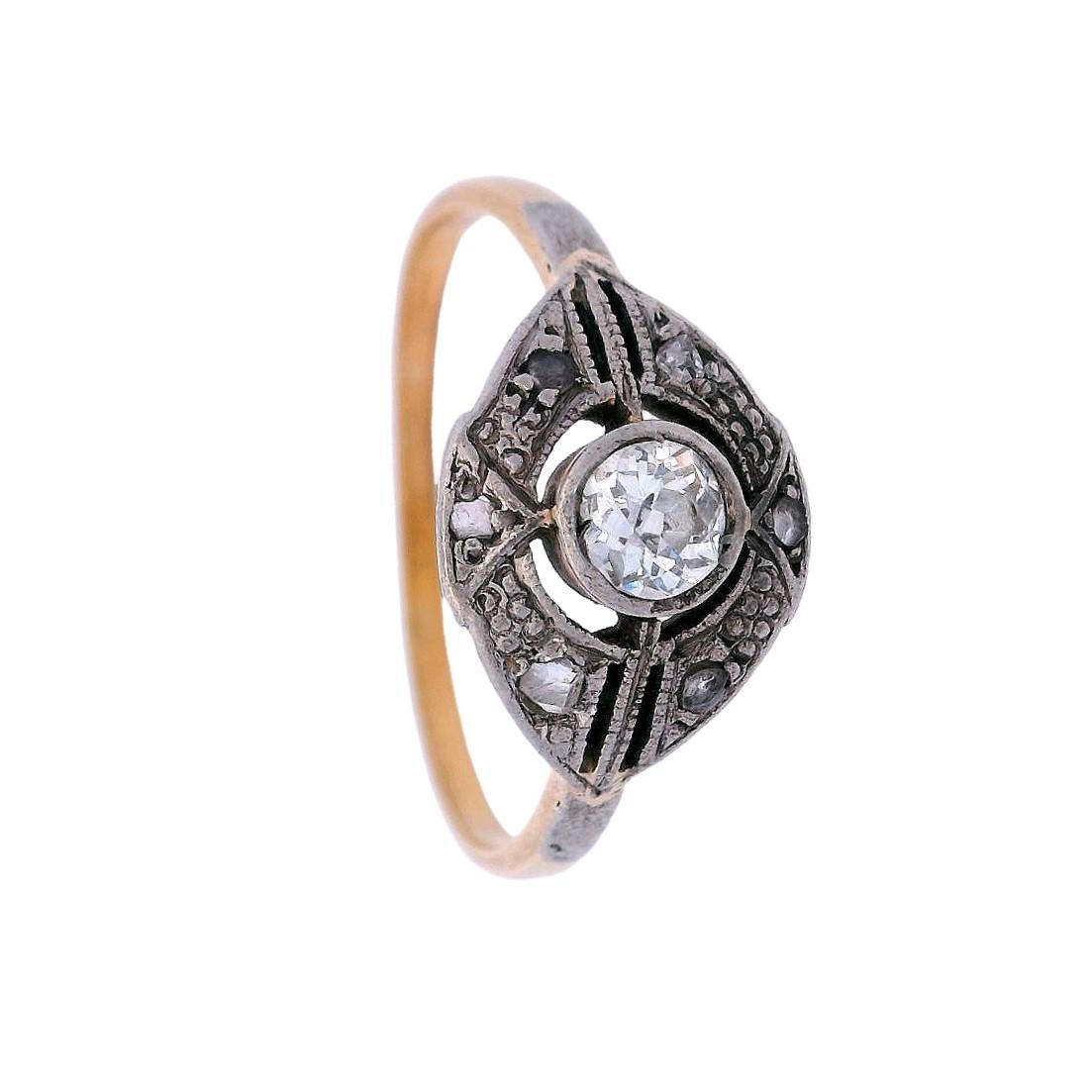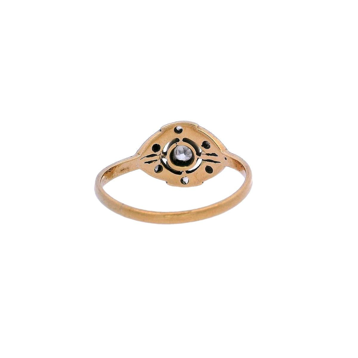 At its center is an old mine-cut diamond, weighing approximately 0.30 carats, graded H-J color and VS2 clarity, radiating a beautiful vintage brilliance. Surrounding the centerpiece are six rose-cut diamonds, with a combined weight of approximately 0.03 carats, adding a delicate sparkle to the design. This ring is a stunning symbol of Edwardian artistry, perfect for those who treasure antique jewelry with enduring charm.