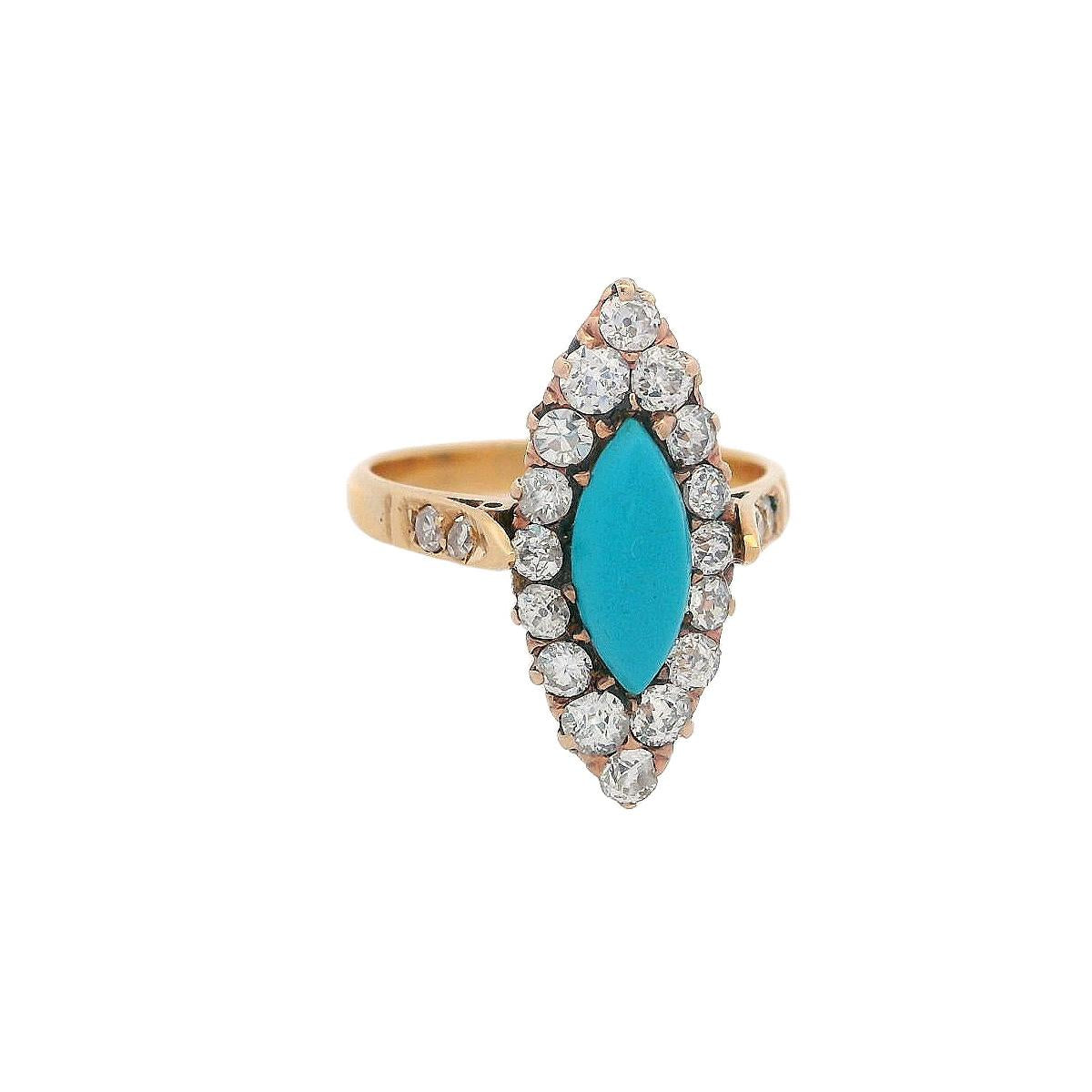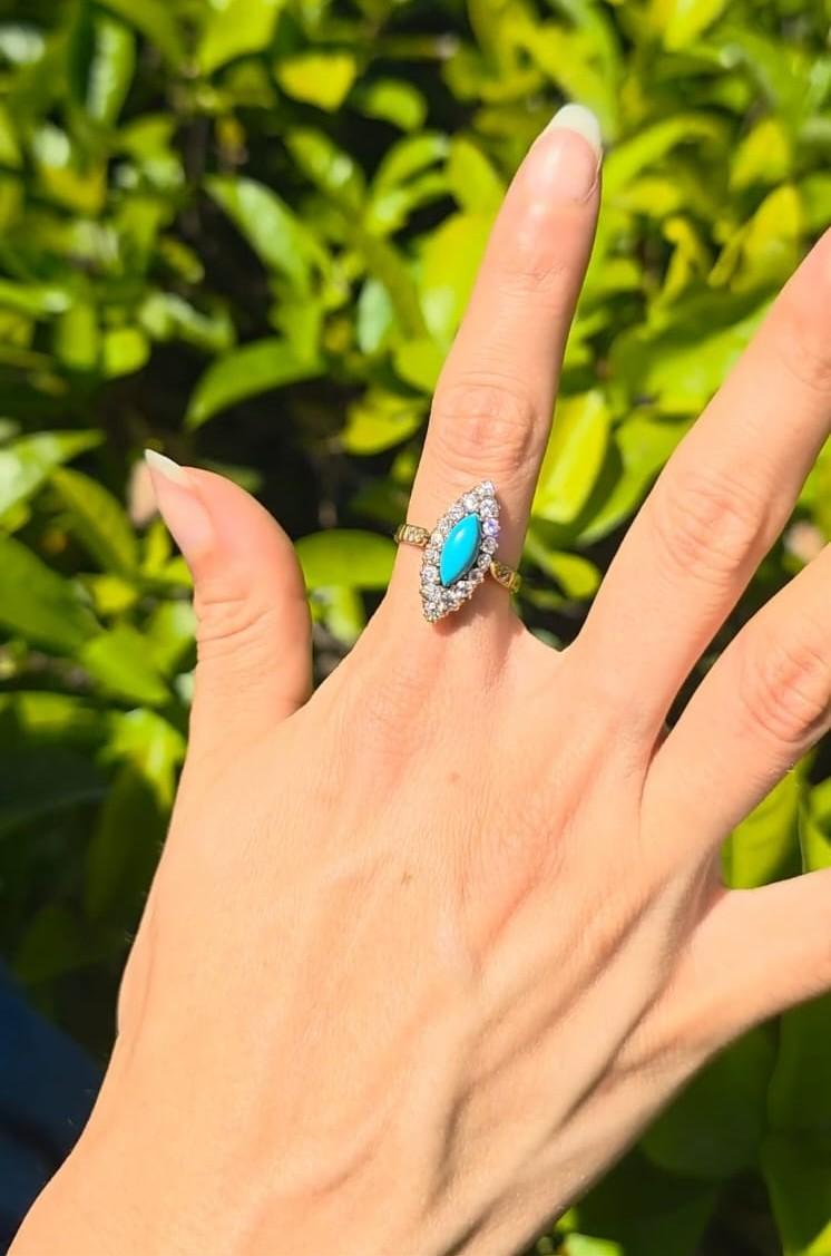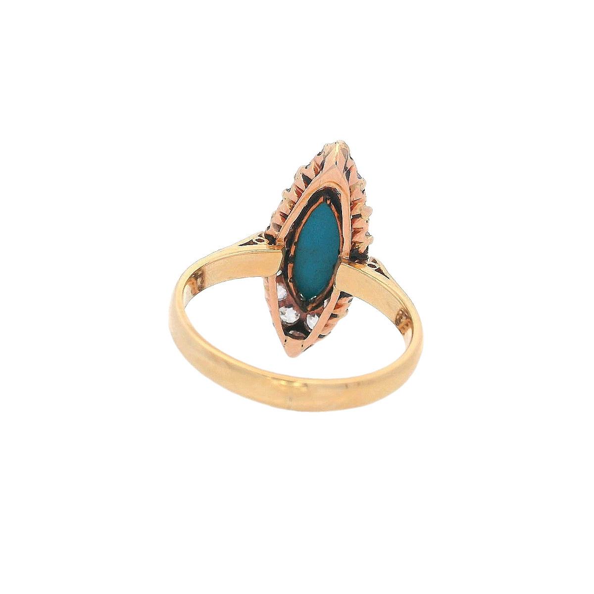 Victorian 1910 Navette Ring in 18kt yellow Gold with Turquoise and Diamonds